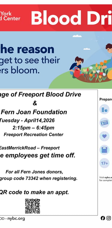 Join the Fern Joan Foundation, Village of Freeport, and New York Blood Center for a community blood drive on April 14, 2026 at the Freeport Recreation Center.